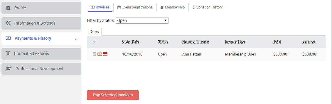 - This will take you to the “Payments & History” section of your profile. From here you will be able to download or print the invoice or pay online with a credit card.