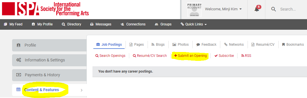 The performing arts-focused job postings are located in ISPA's Career Center. You may access the Career Center by navigating to "Professional Development" and clicking on "Career Center".
