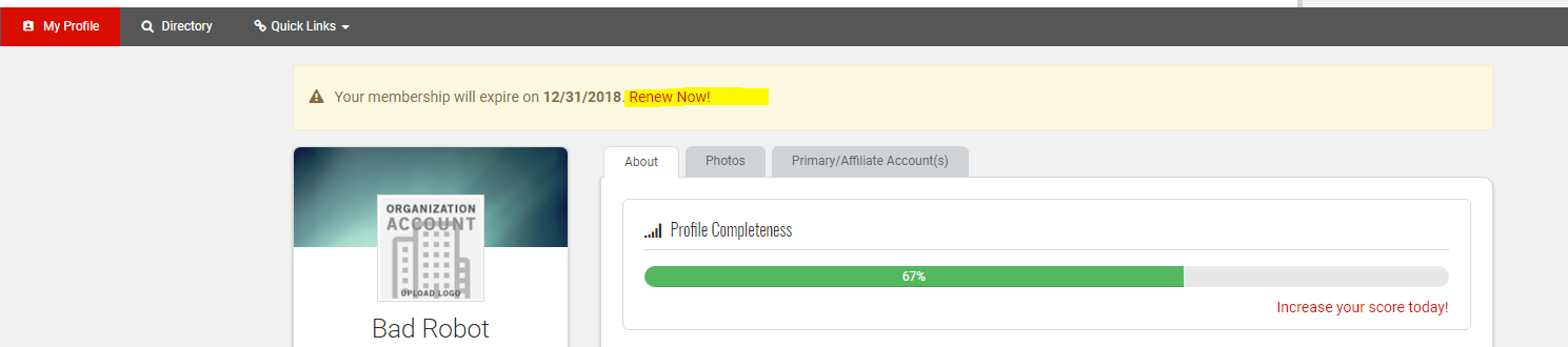 - From the My Profile view, you will be prompted to renew; click on “Renew Now!”